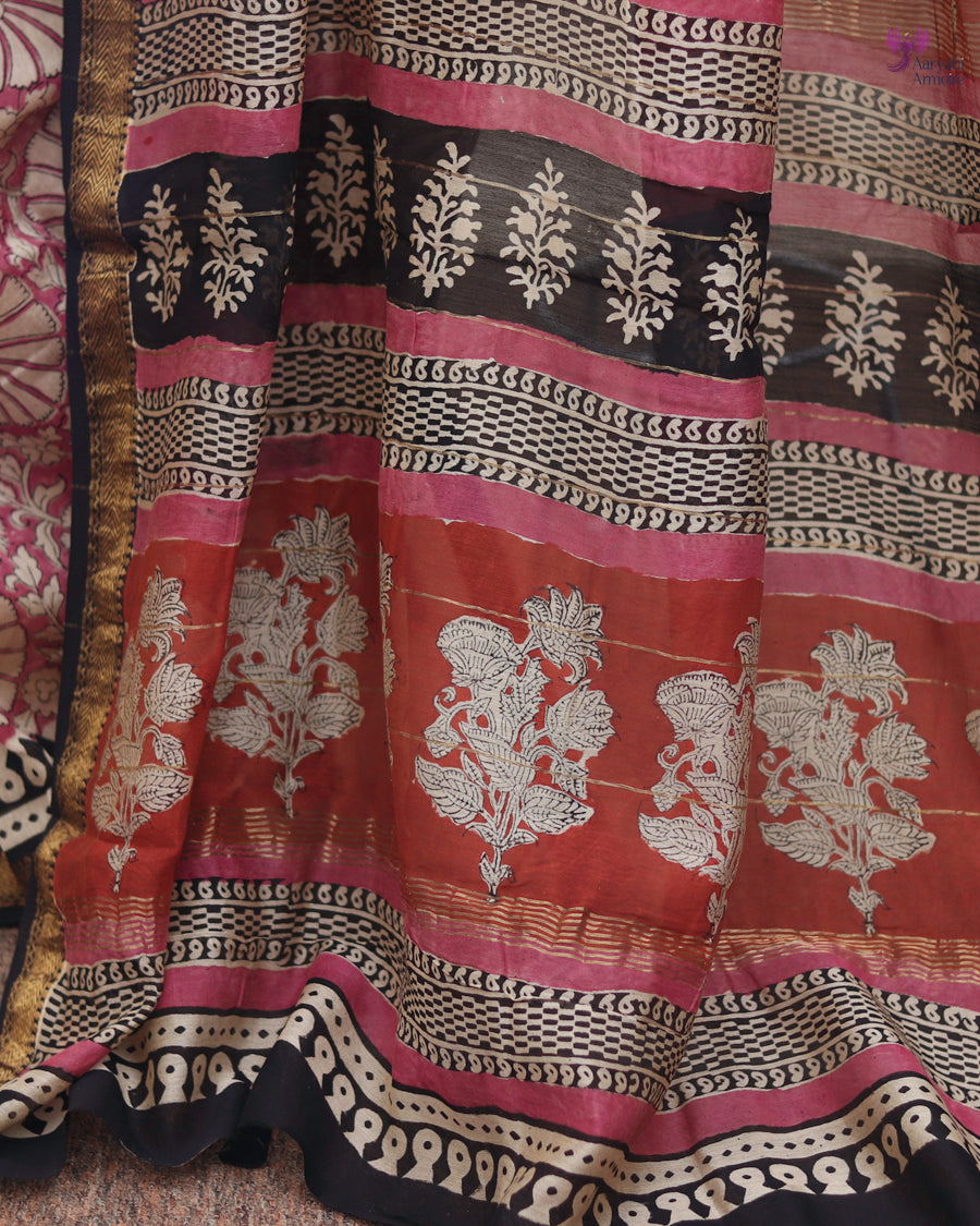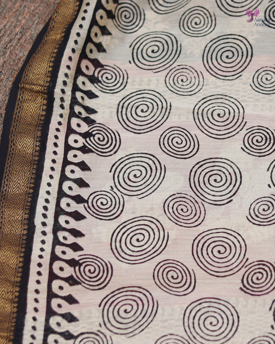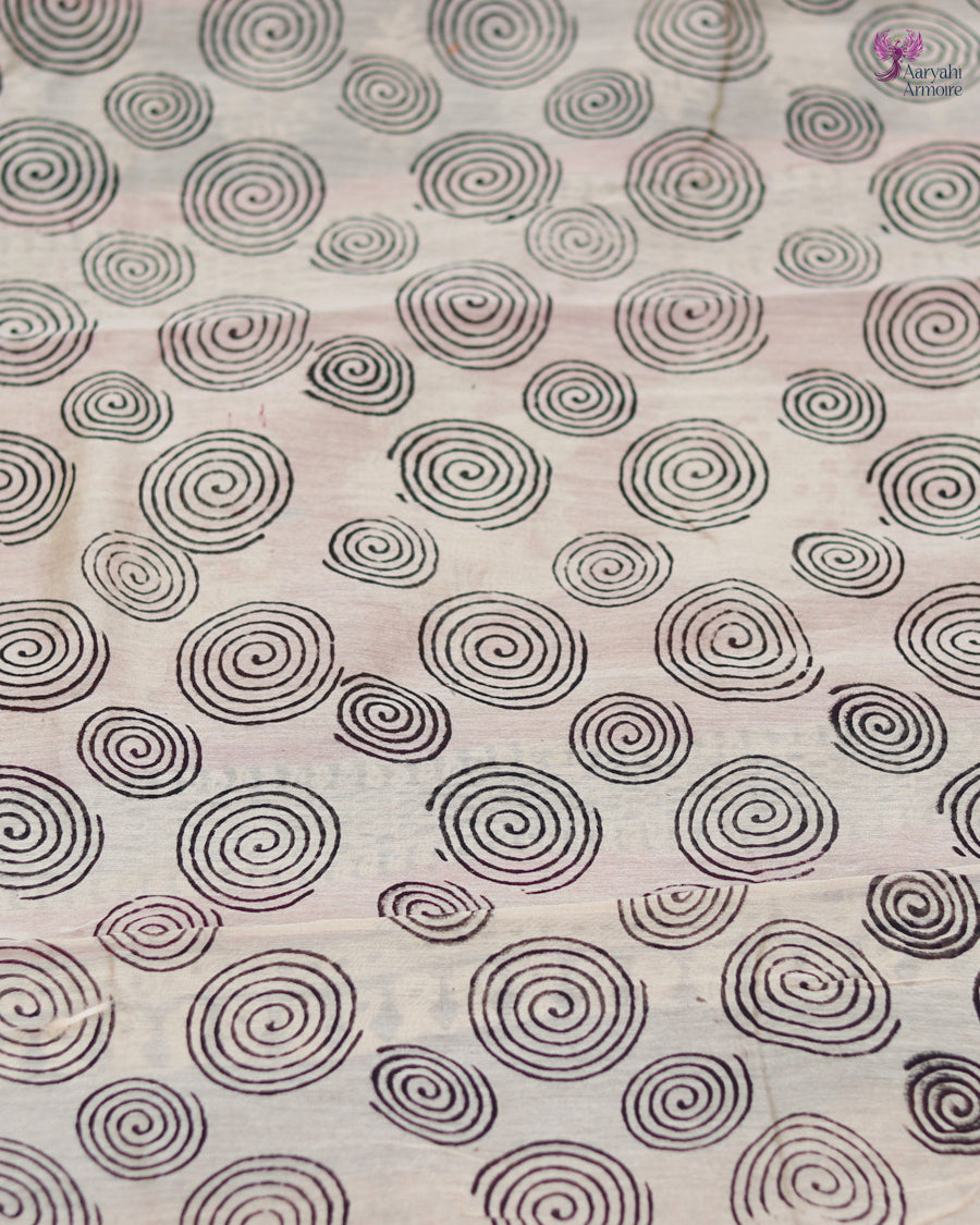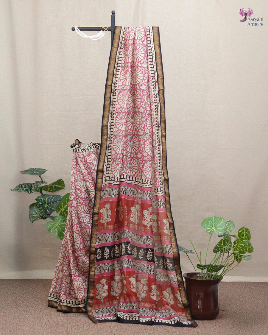 Discover the charm of this pretty Maheshwari silk hand-block saree, showcasing delicate motifs in soothing onion pink.