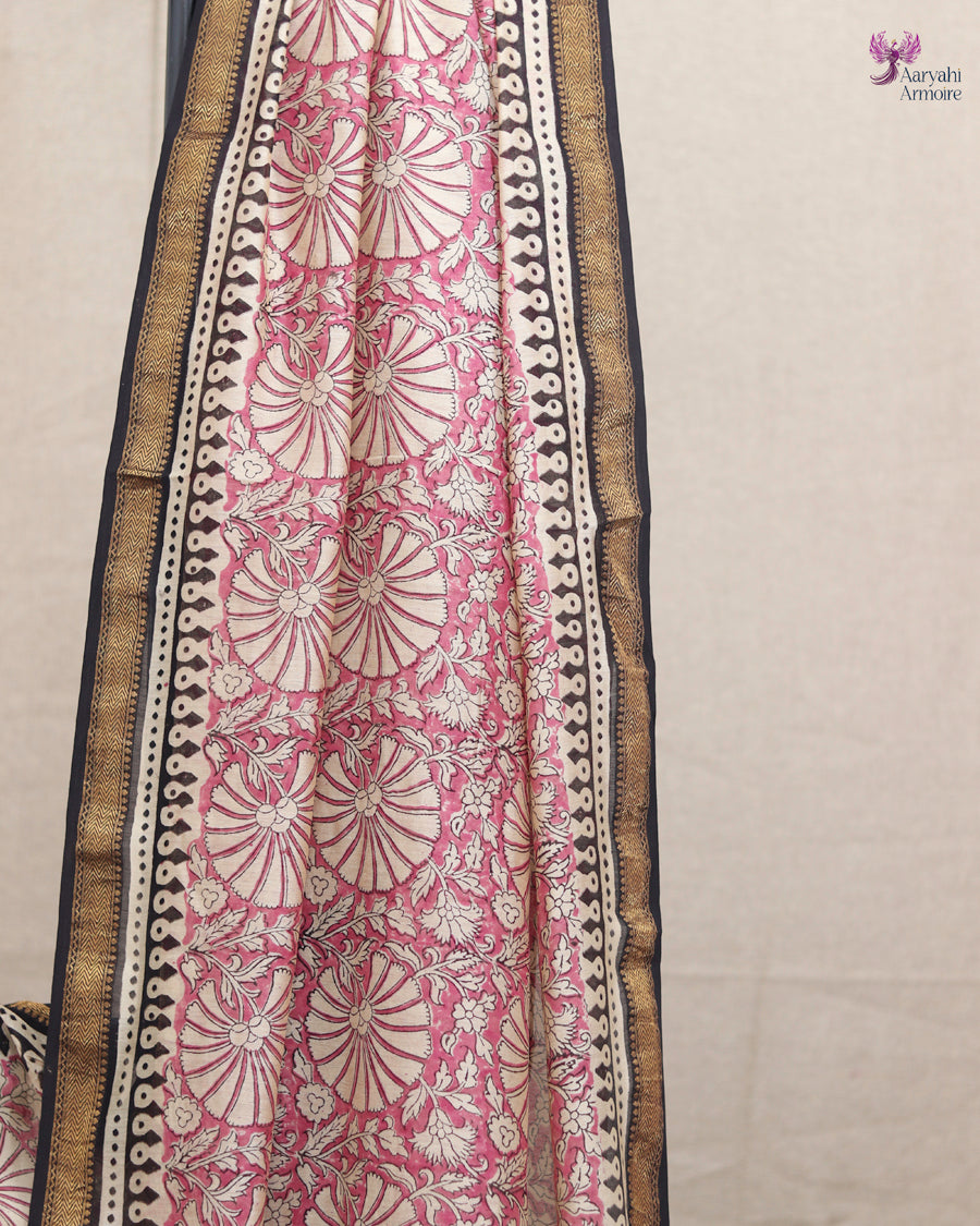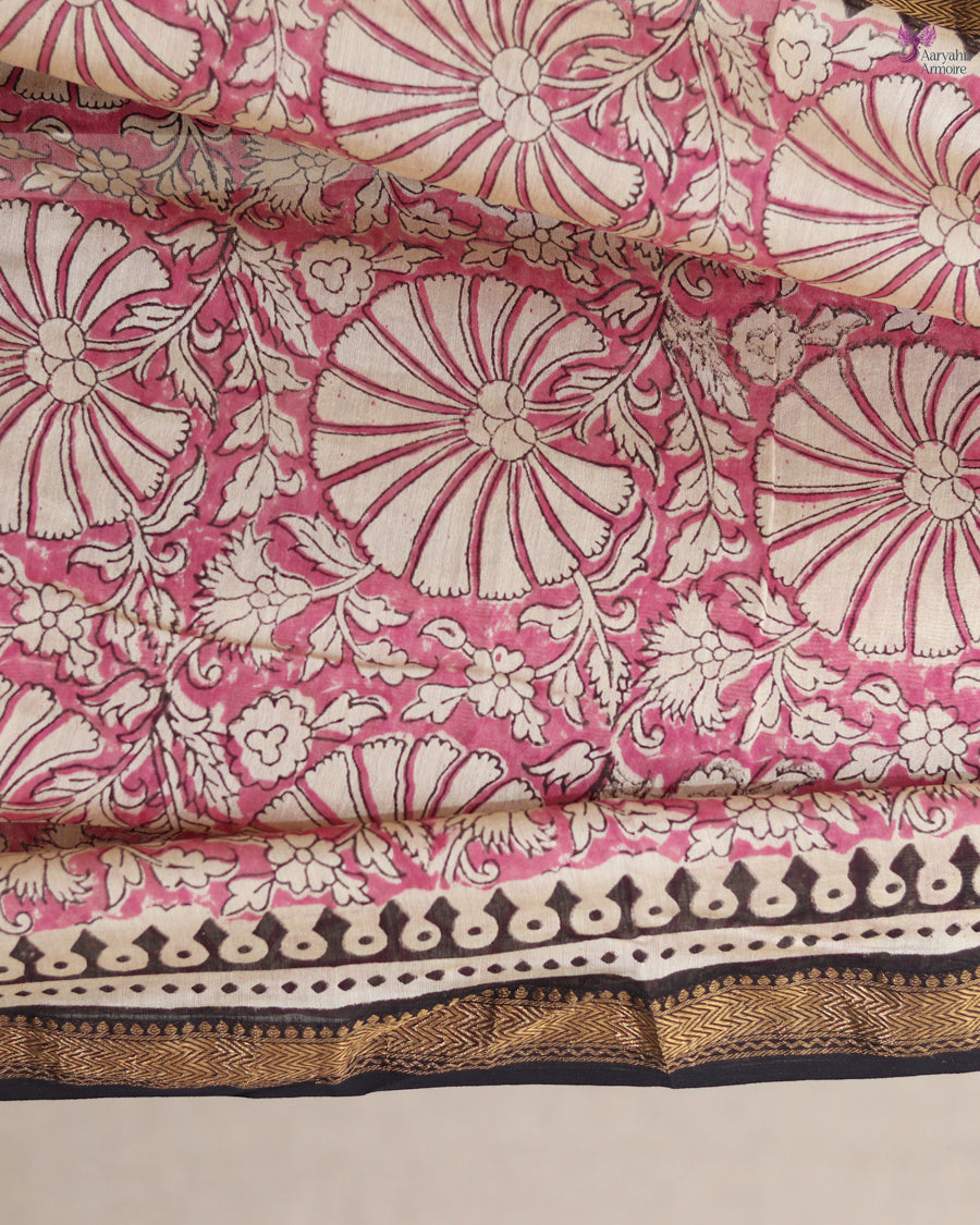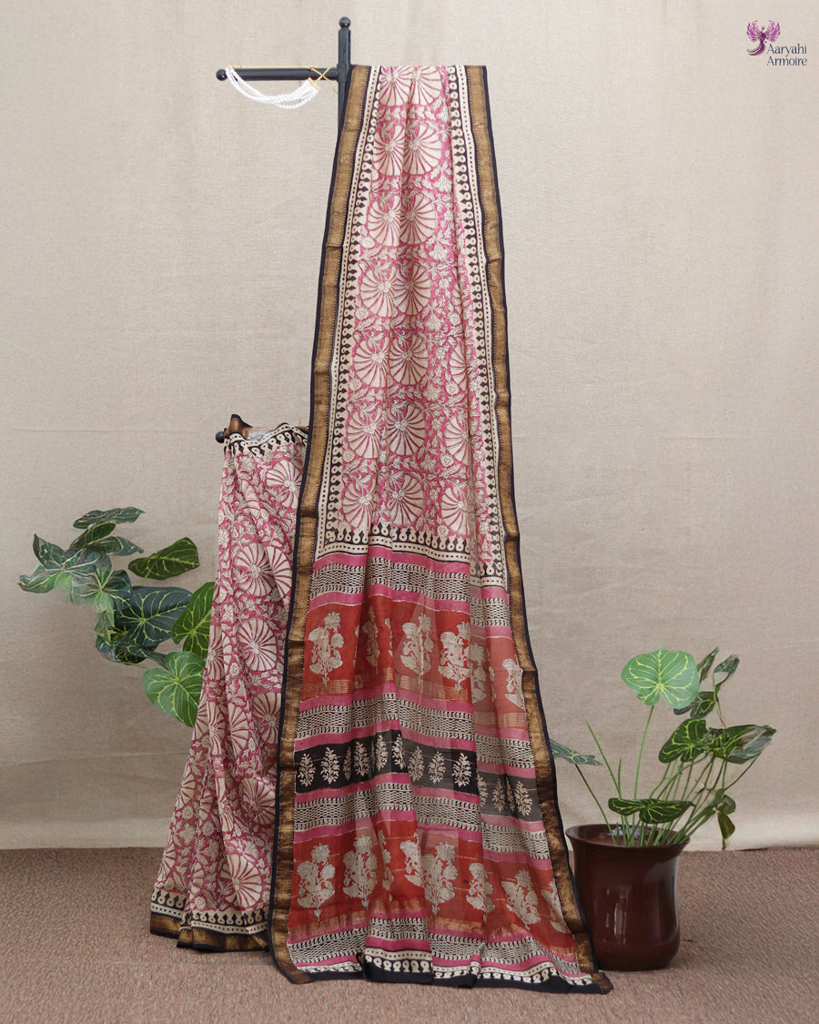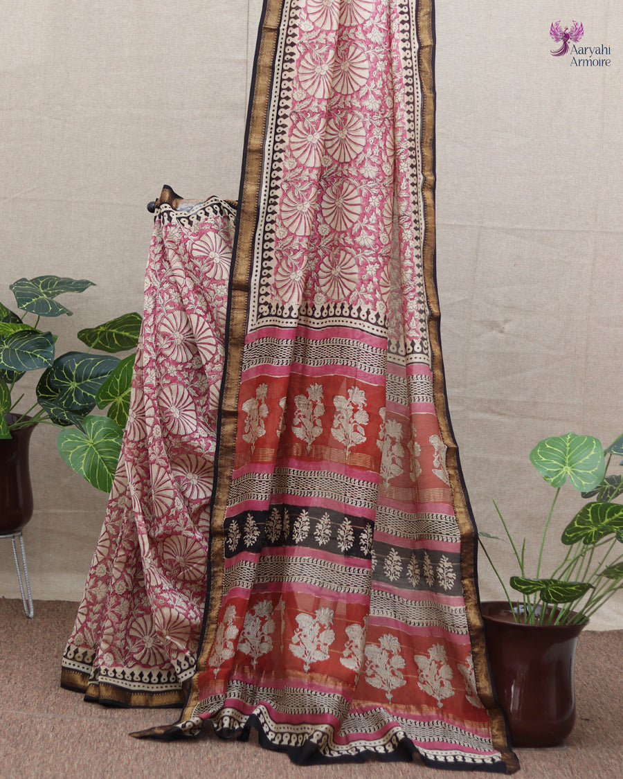 Discover the charm of this pretty Maheshwari silk hand-block saree, showcasing delicate motifs in soothing onion pink.