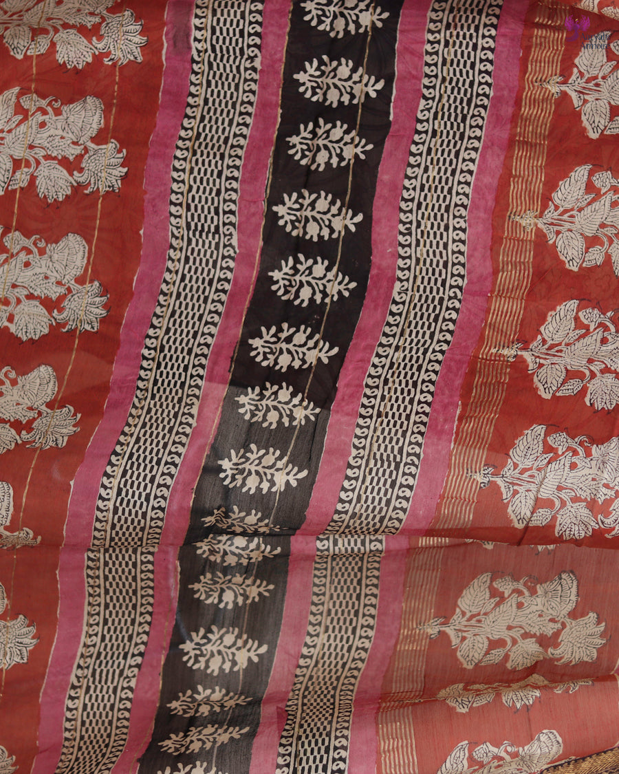 Its beautifully crafted pallu — detailed in rust, white, and black — brings a touch of artisanal artistry, making the saree both striking and timeless.