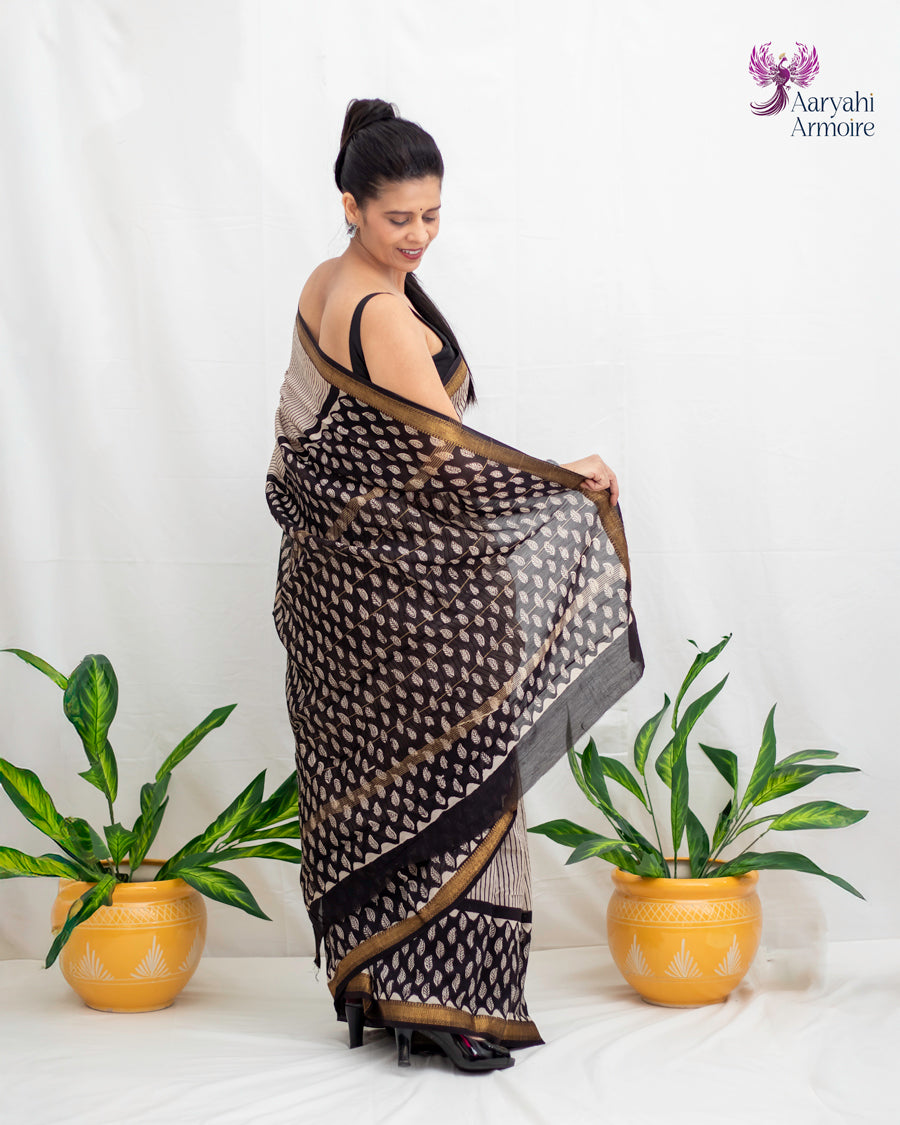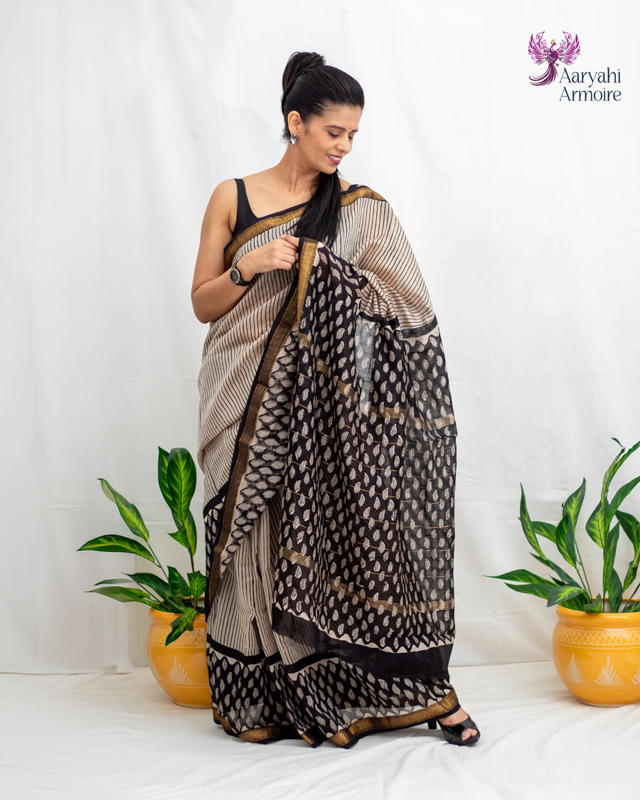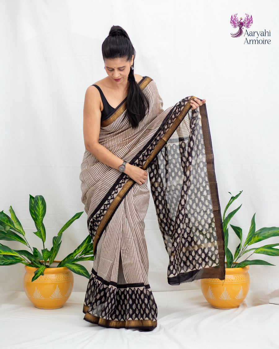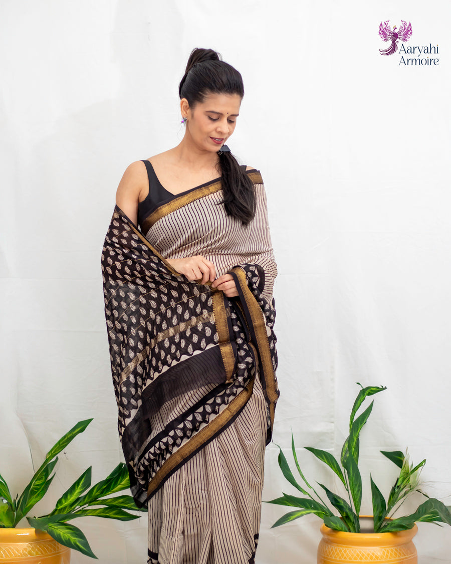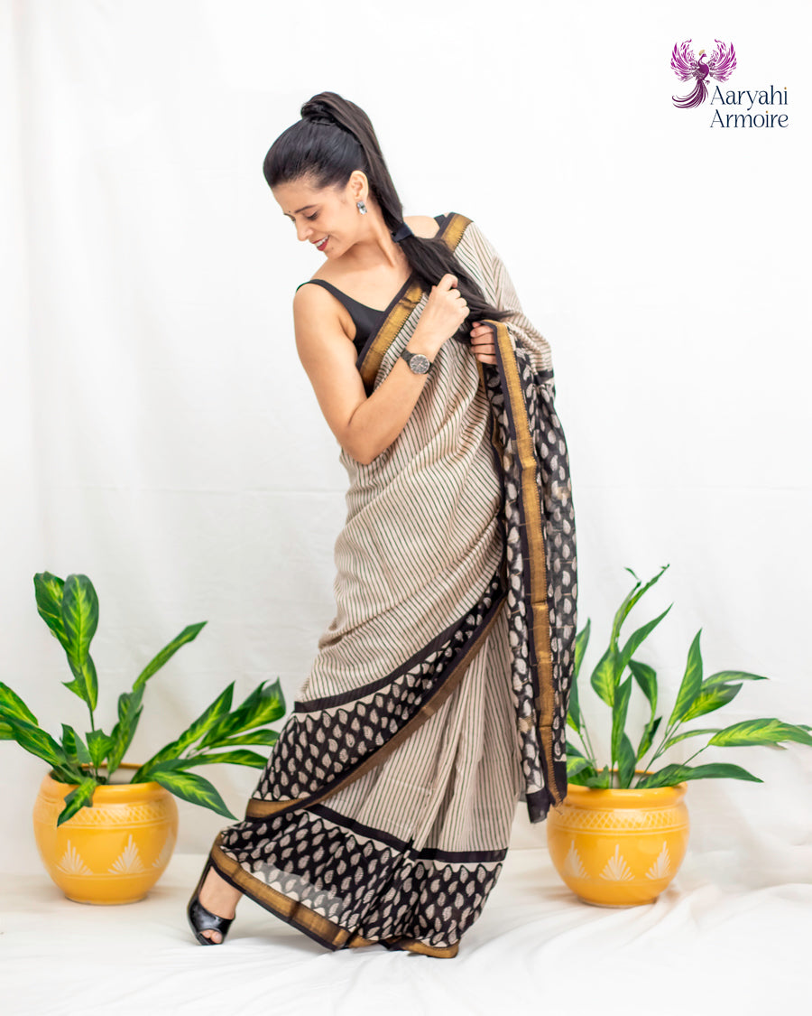 This Maheshwari silk saree in soothing beige weaves together tradition and elegance. Featuring geometric hand block prints with a bold black border and pallu, it balances subtlety with statement. Its silky fabric, smooth drape, and classy appeal make it a timeless piece for every occasion.