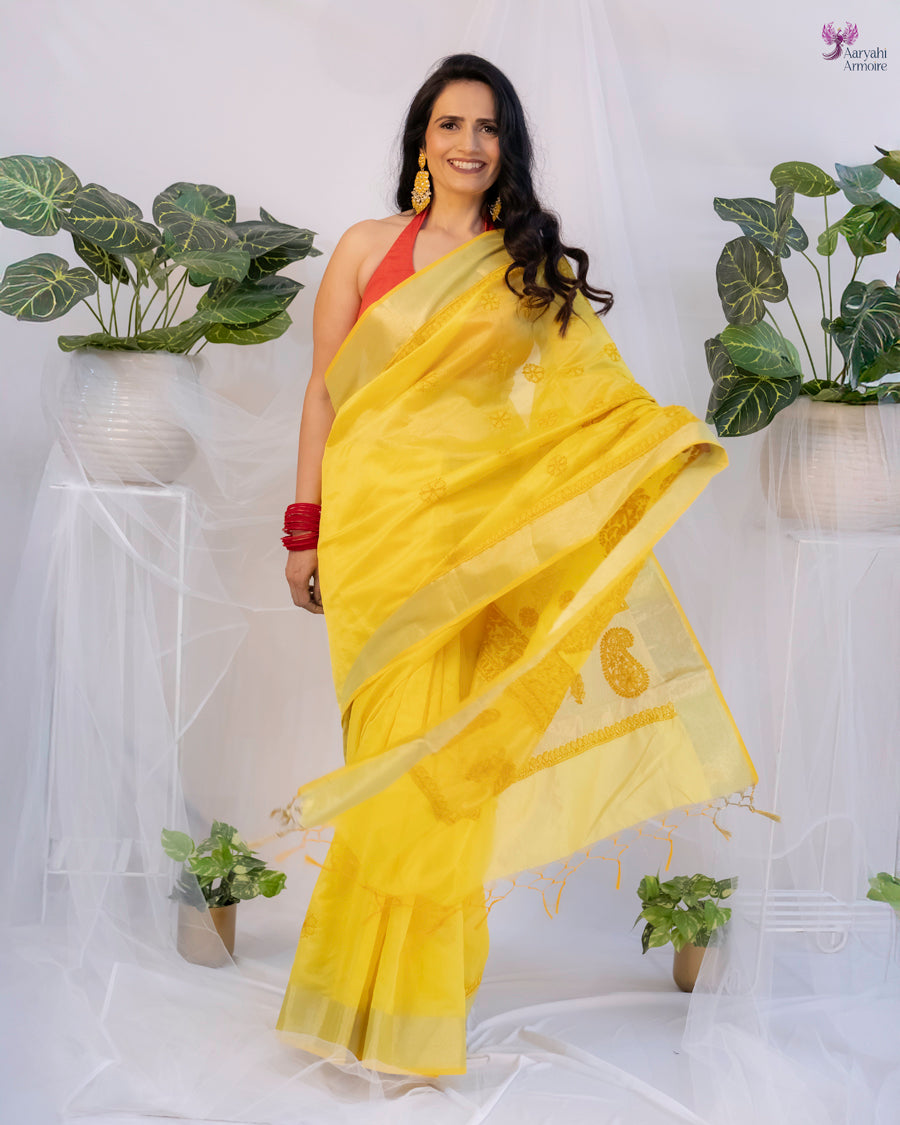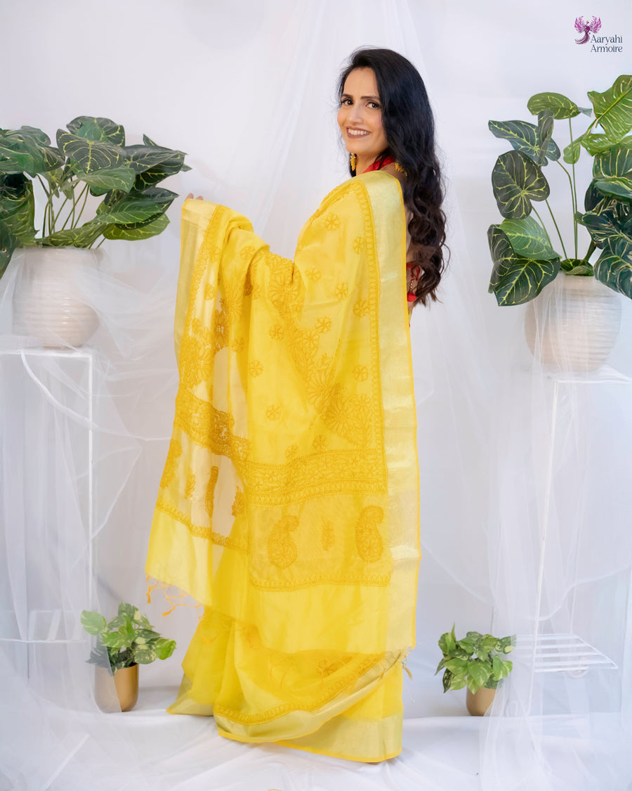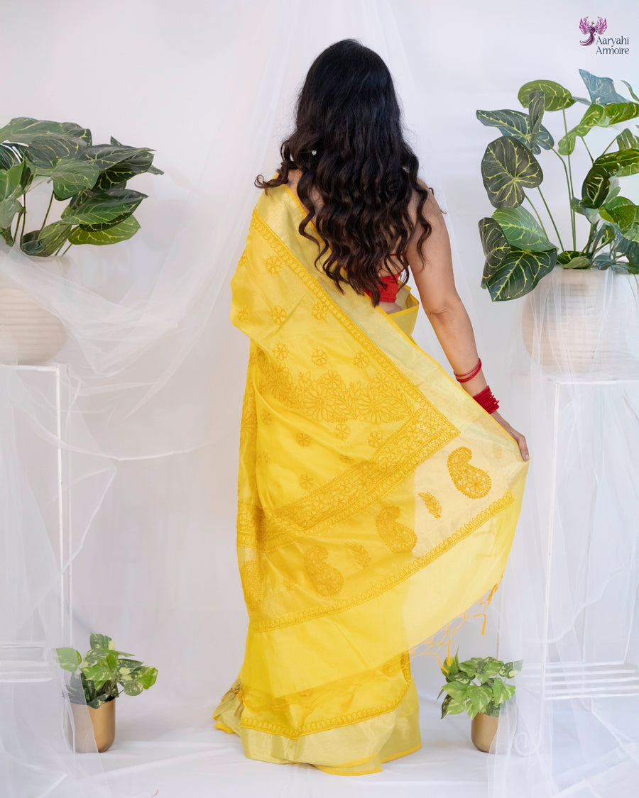 Featuring intricate Lucknavi embroidery all over, the tissue border and pallu elevate its festive appeal, while its sheer transparency and subtle sheen reflect the delicate charm signature to this heritage weave.