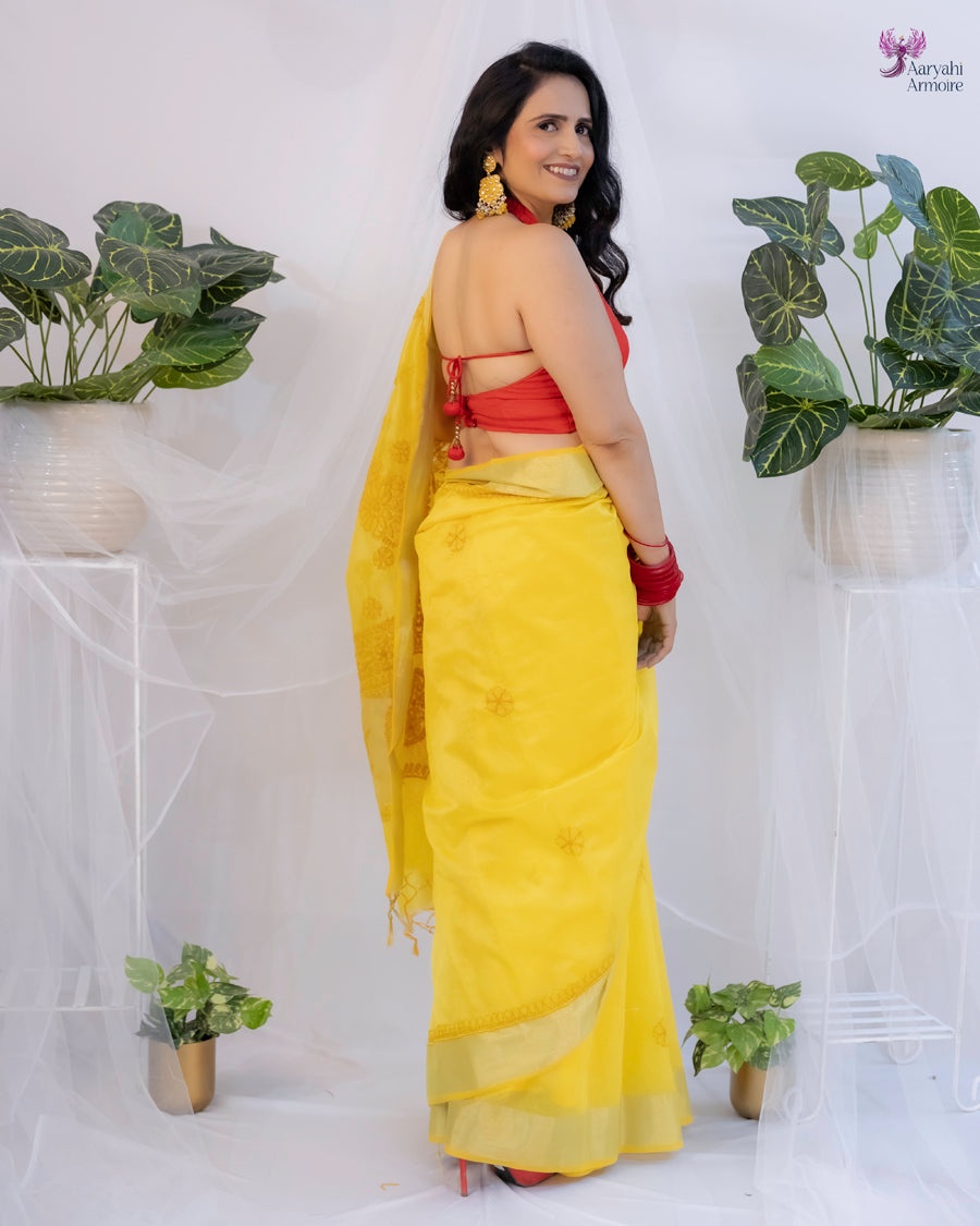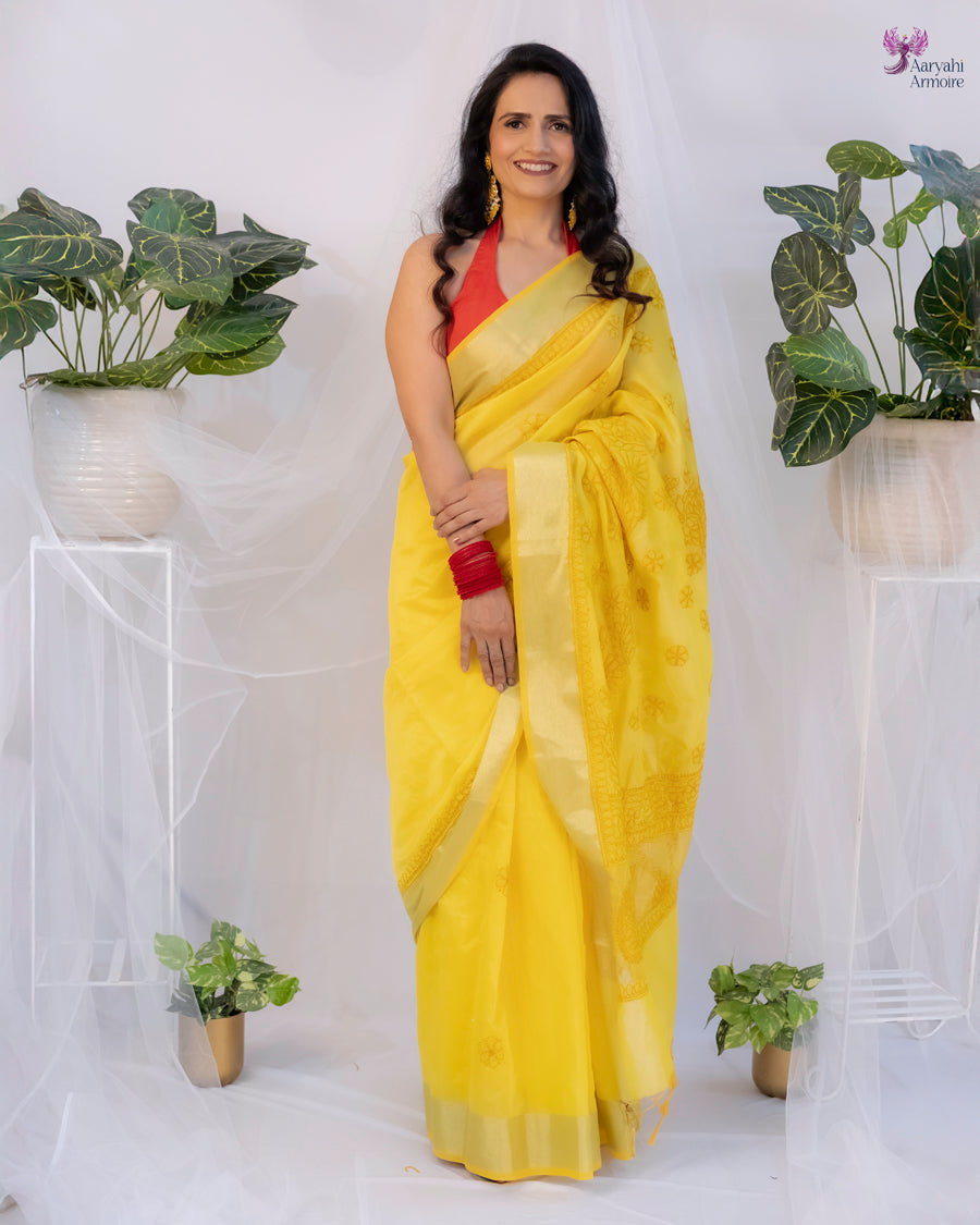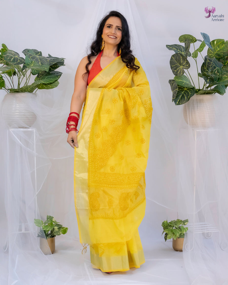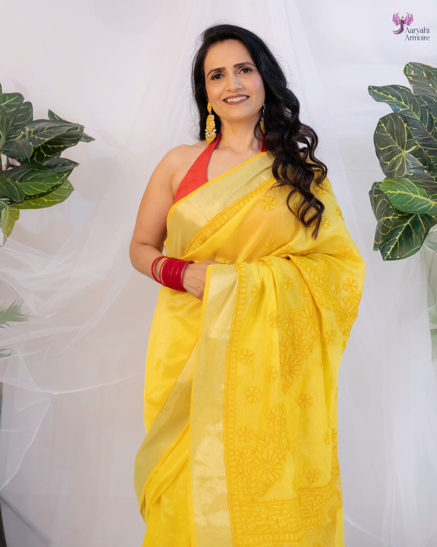 Featuring intricate Lucknavi embroidery all over, the tissue border and pallu elevate its festive appeal, while its sheer transparency and subtle sheen reflect the delicate charm signature to this heritage weave.