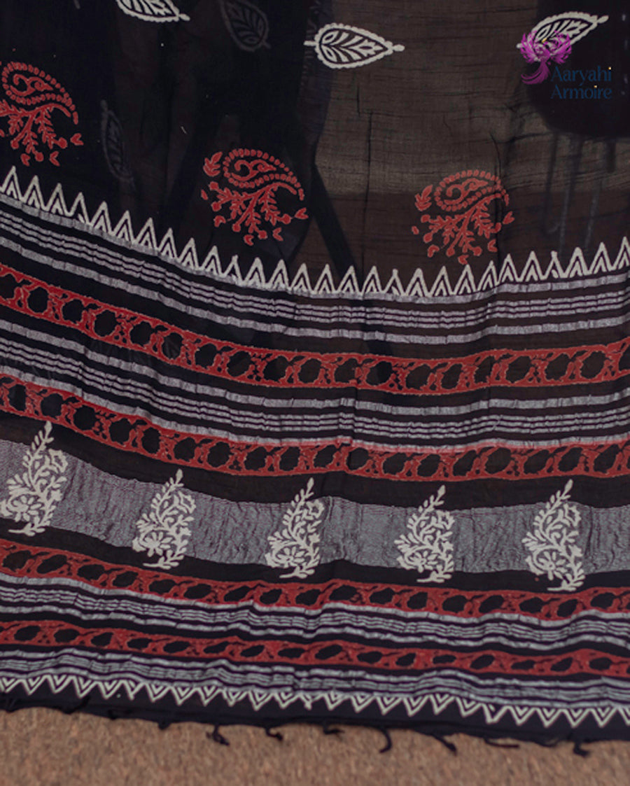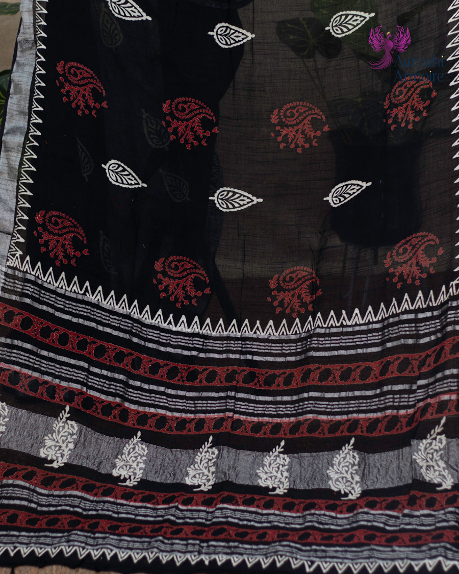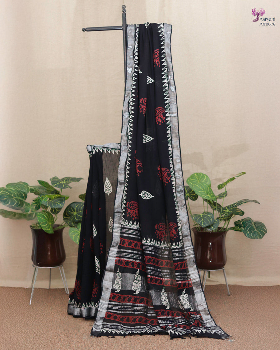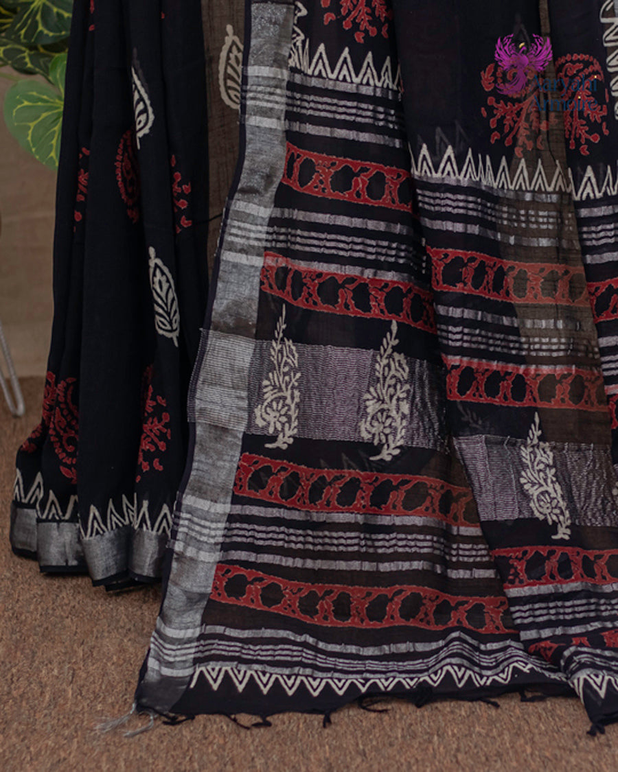 Celebrate effortless elegance with this beautiful hand-block linen saree, adorned with striking red and white motifs that enhance its timeless charm.