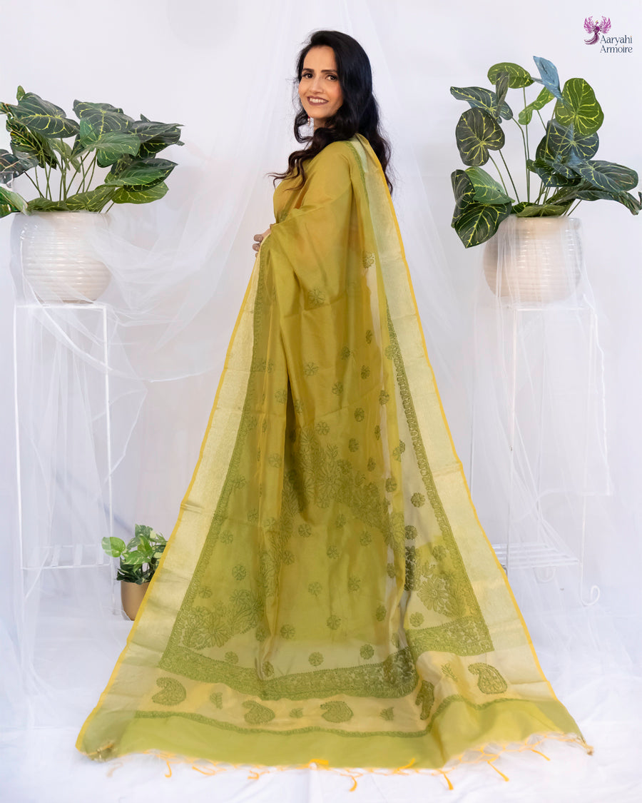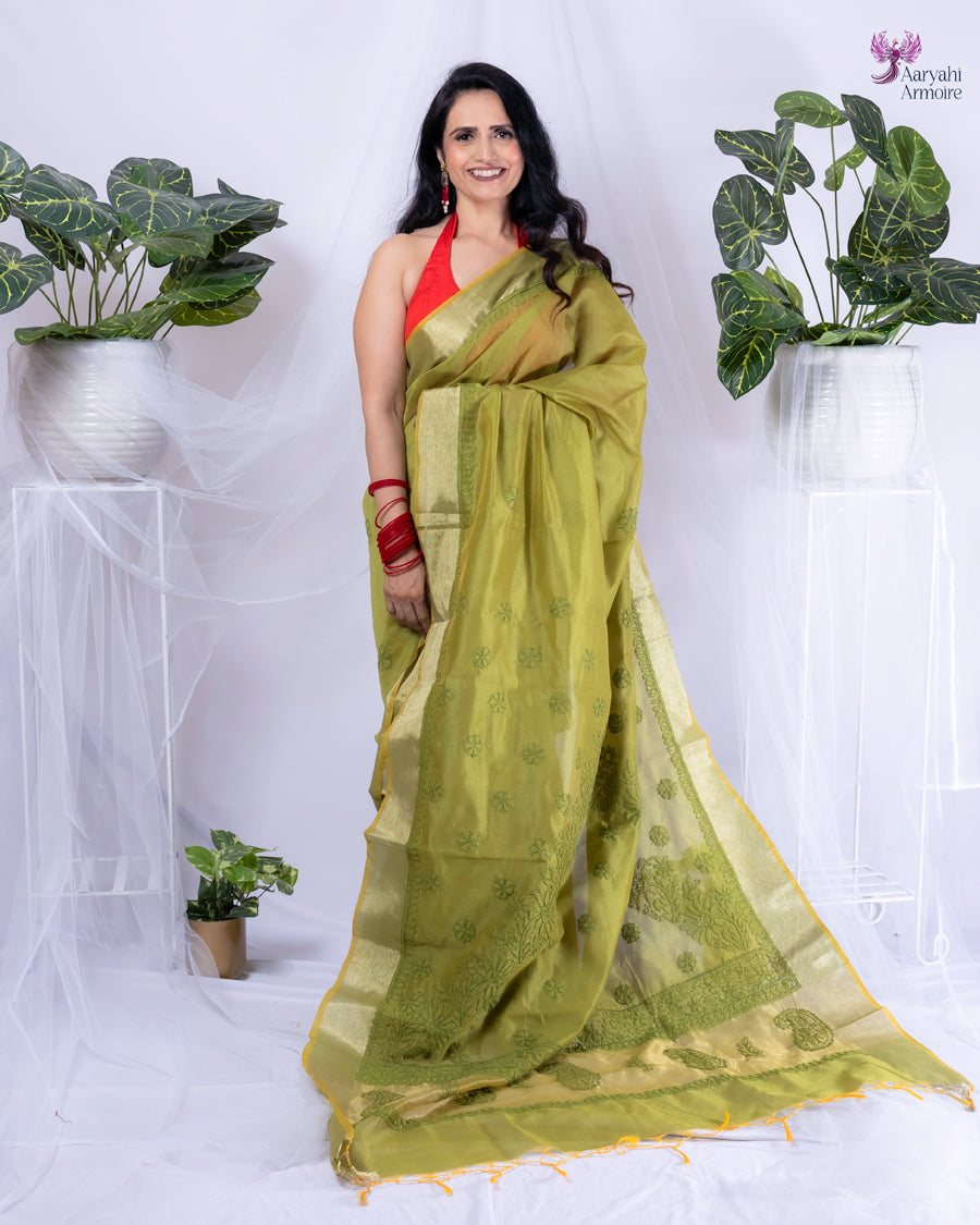 Drape yourself in the elegance of handwoven cotton Chanderi. This lush green saree is adorned with intricate Lucknavi embroidery all over, while the tissue border and pallu add a touch of festive charm.