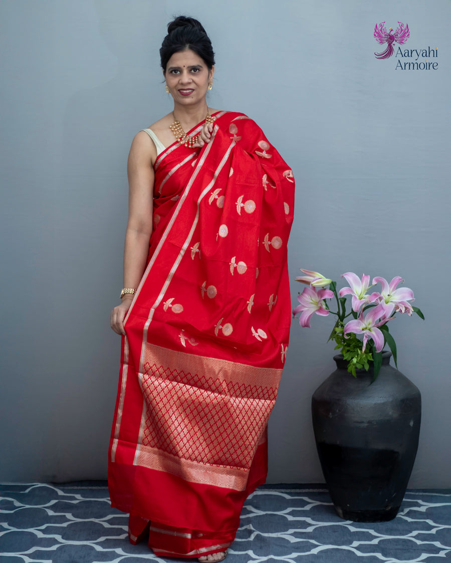 Drape yourself in the luxury of semi-Katan silk. Woven from fine silk threads, this saree offers a rich yet lightweight texture that drapes gracefully. Adorned with intricate zari work featuring boota, floral, and traditional motifs in gold and silver threads, it shimmers beautifully with every movement.