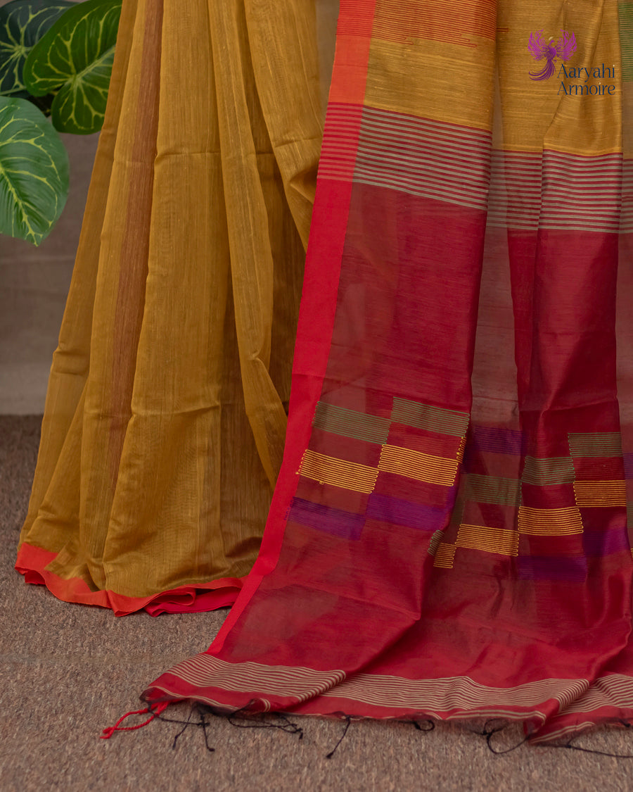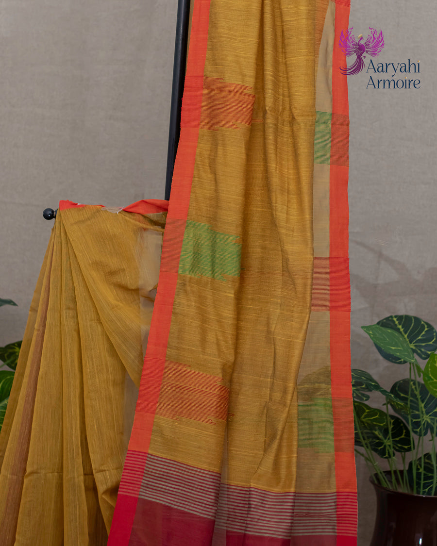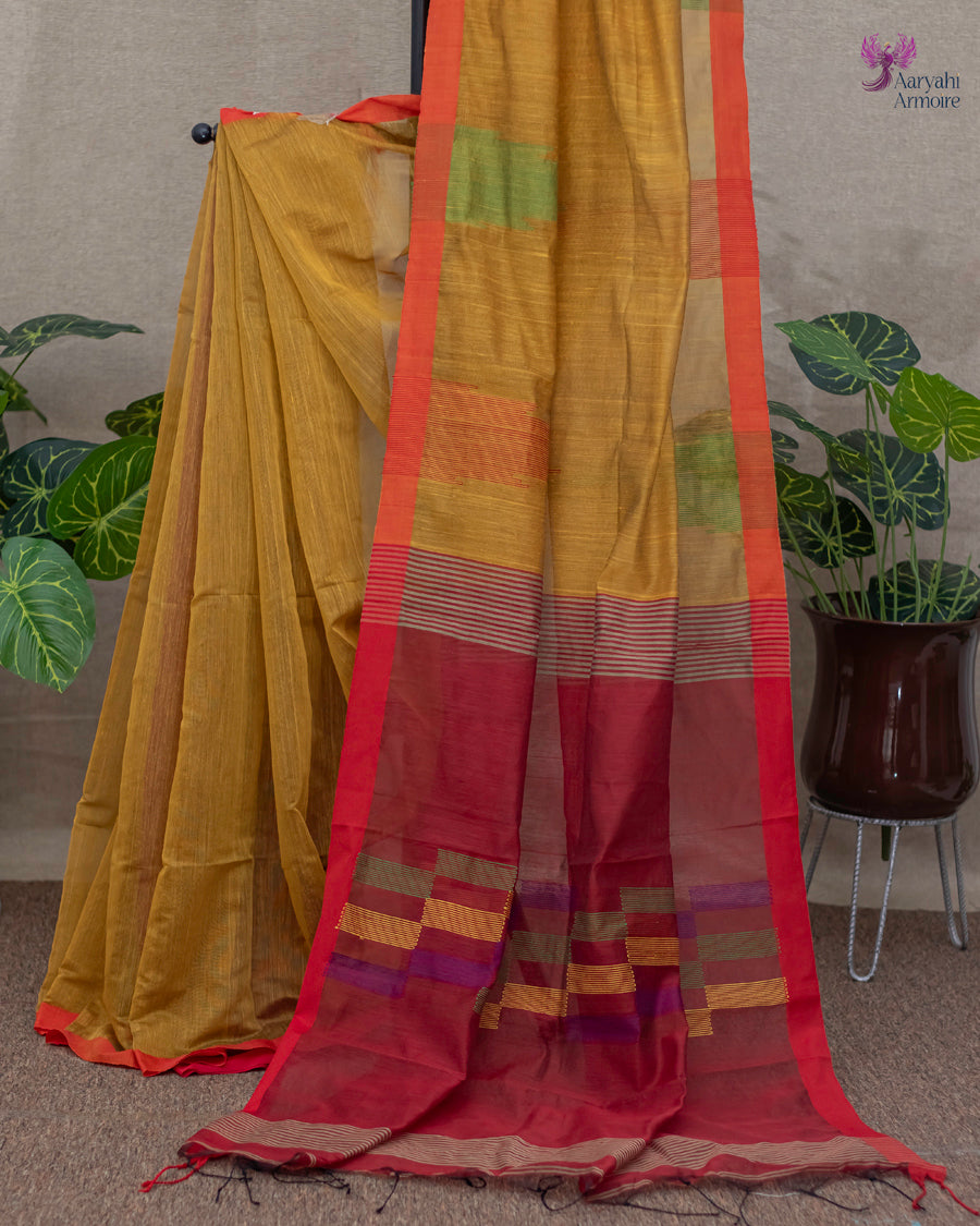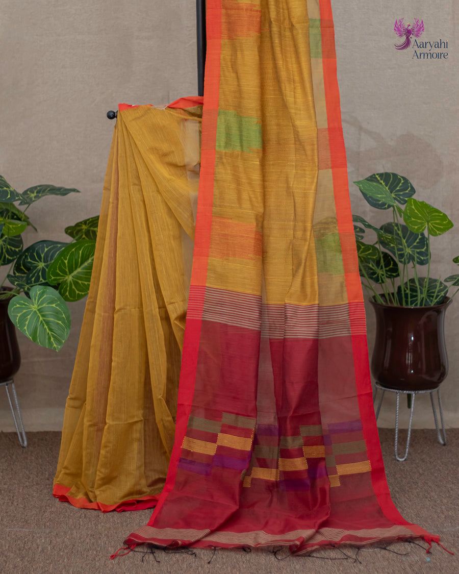 Celebrate vibrant tradition with this beautiful mustard yellow cotton–silk saree, featuring classic temple weaving that adds depth and character to the entire drape.