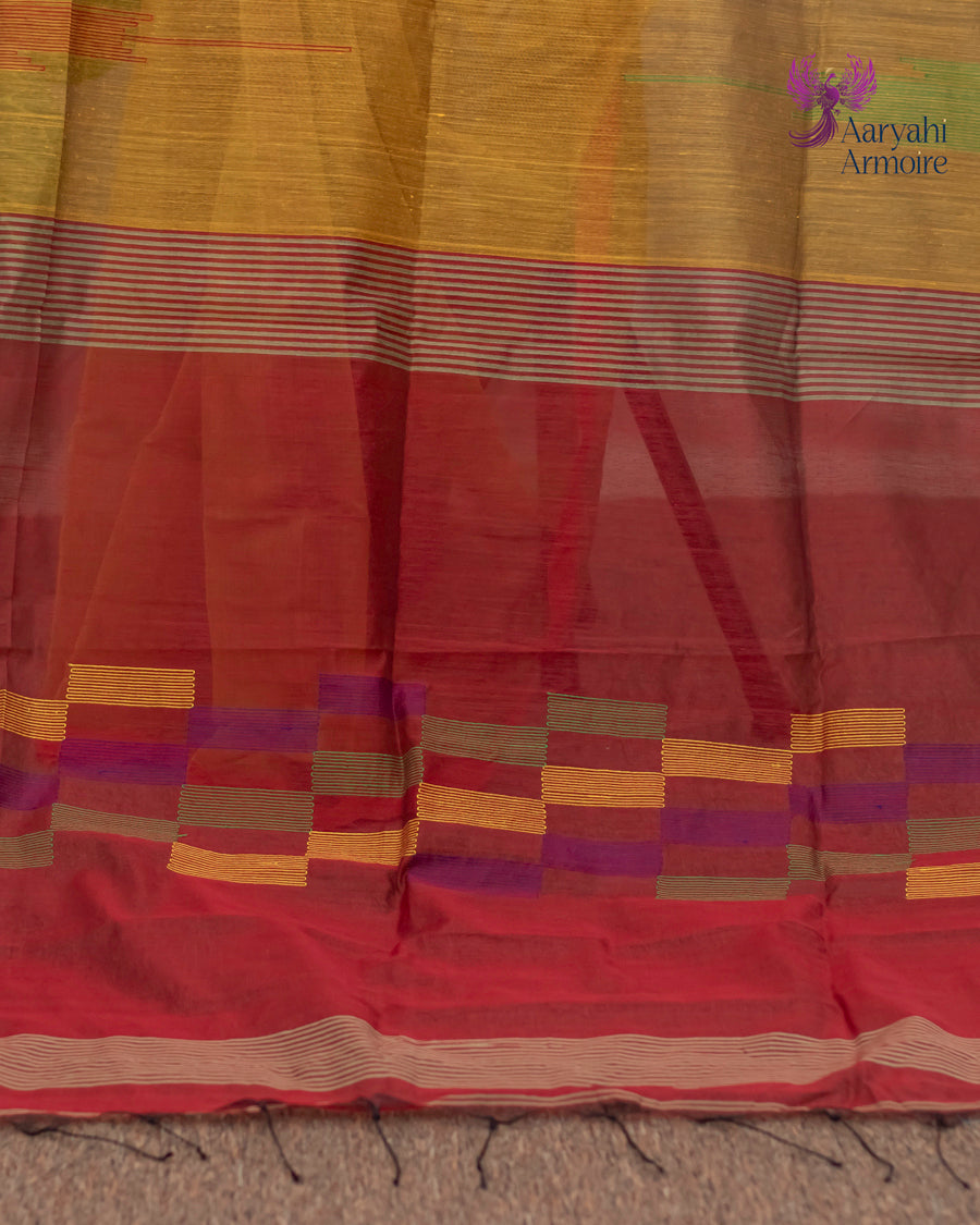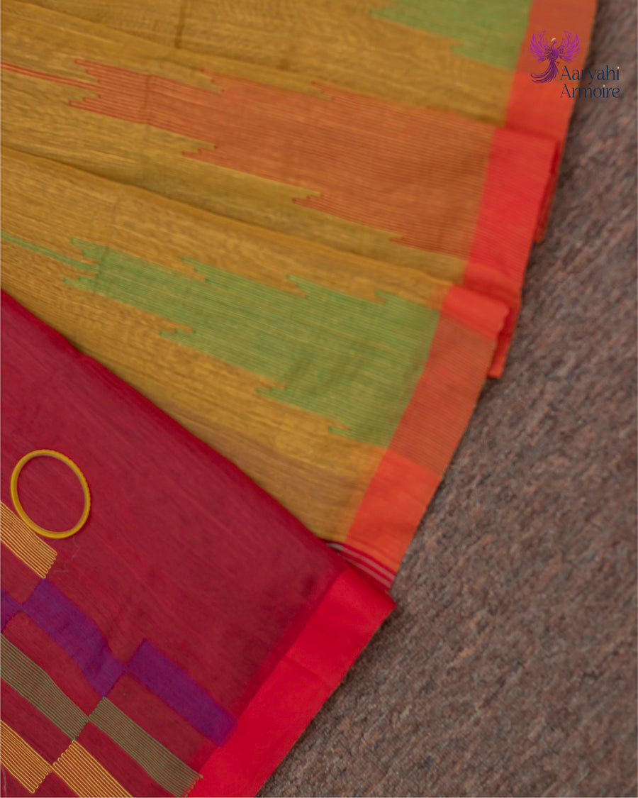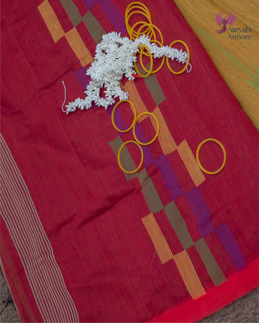 The rich deep red pallu creates a stunning focal point, while the border is detailed in eye-catching shades of green, red, and orange — a striking contrast that enhances its overall appeal.