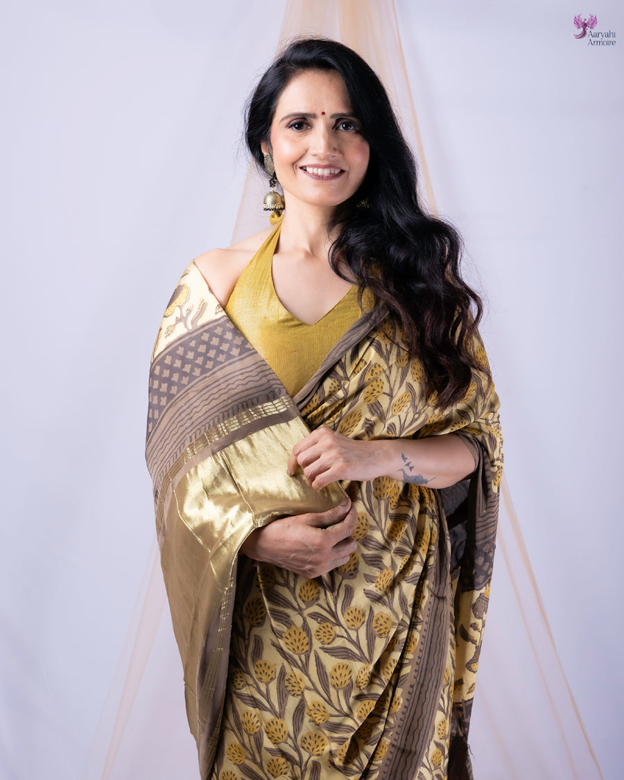 This hand block printed Gold modal silk saree blends the natural sheen of silk with the breathability and comfort of modal, making it feel incredibly gentle on the skin.