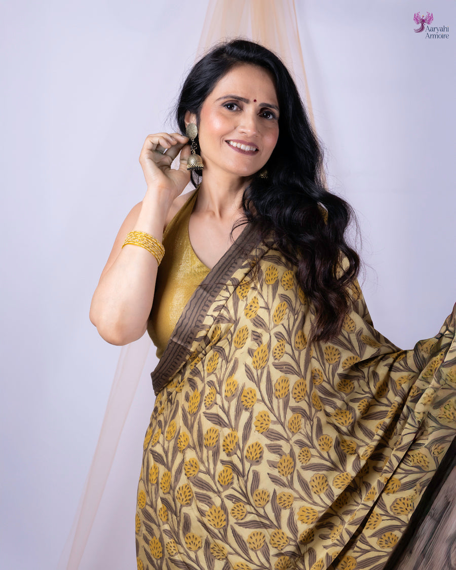 Adorned with floral motifs in shades of off-white, yellow, brown and gold, its soft, silky fabric drapes with effortless elegance in every pleat.