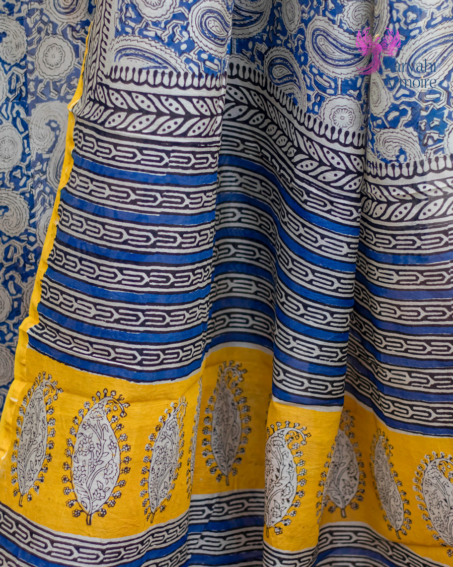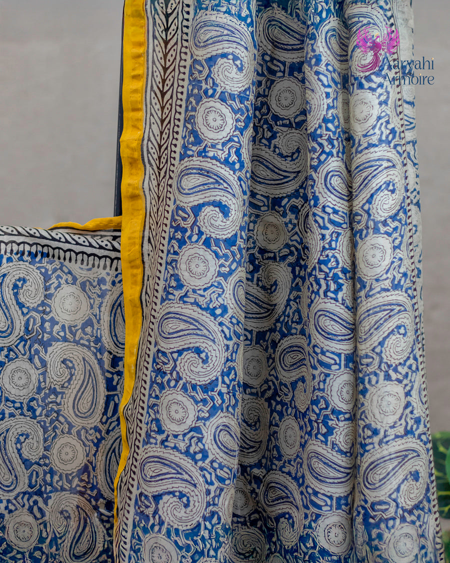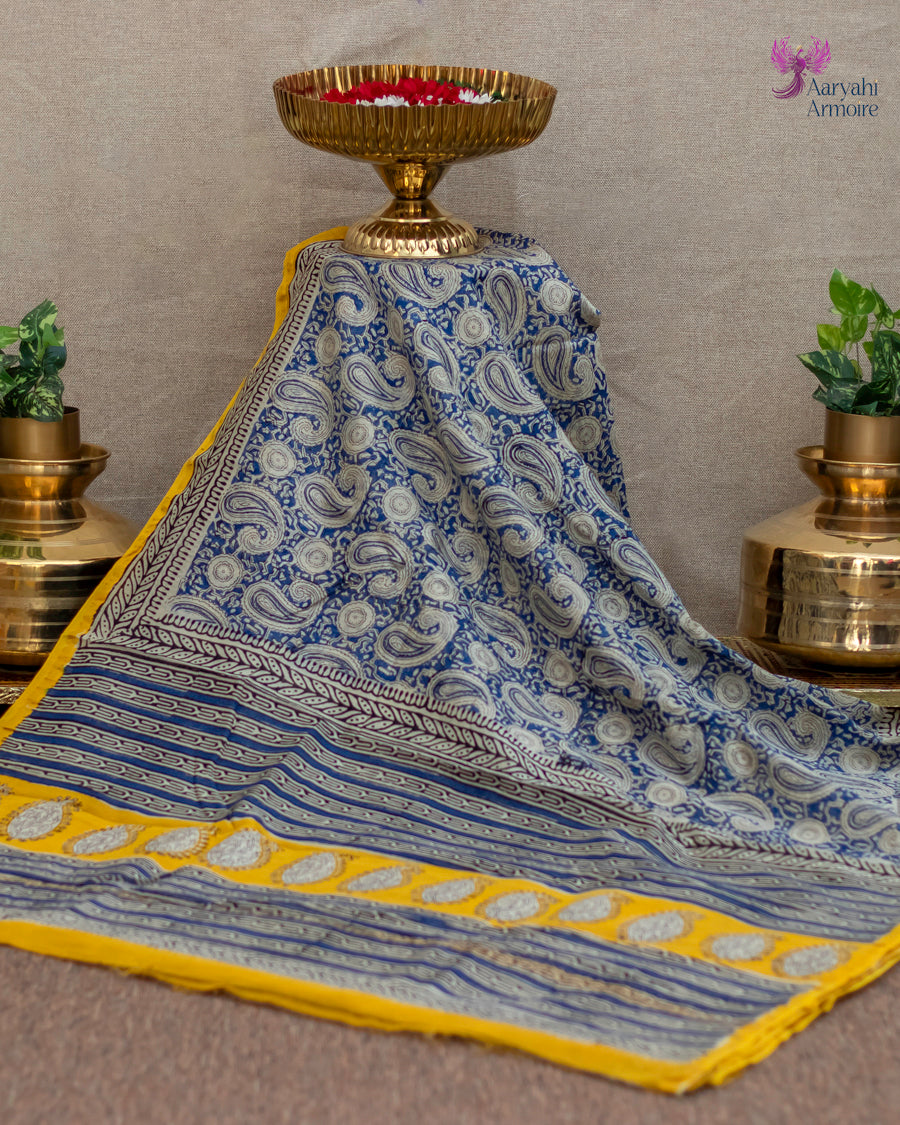 Experience the understated elegance of this beautiful Chanderi silk hand-block saree, adorned with geometric motifs in striking shades of blue, white, and black.